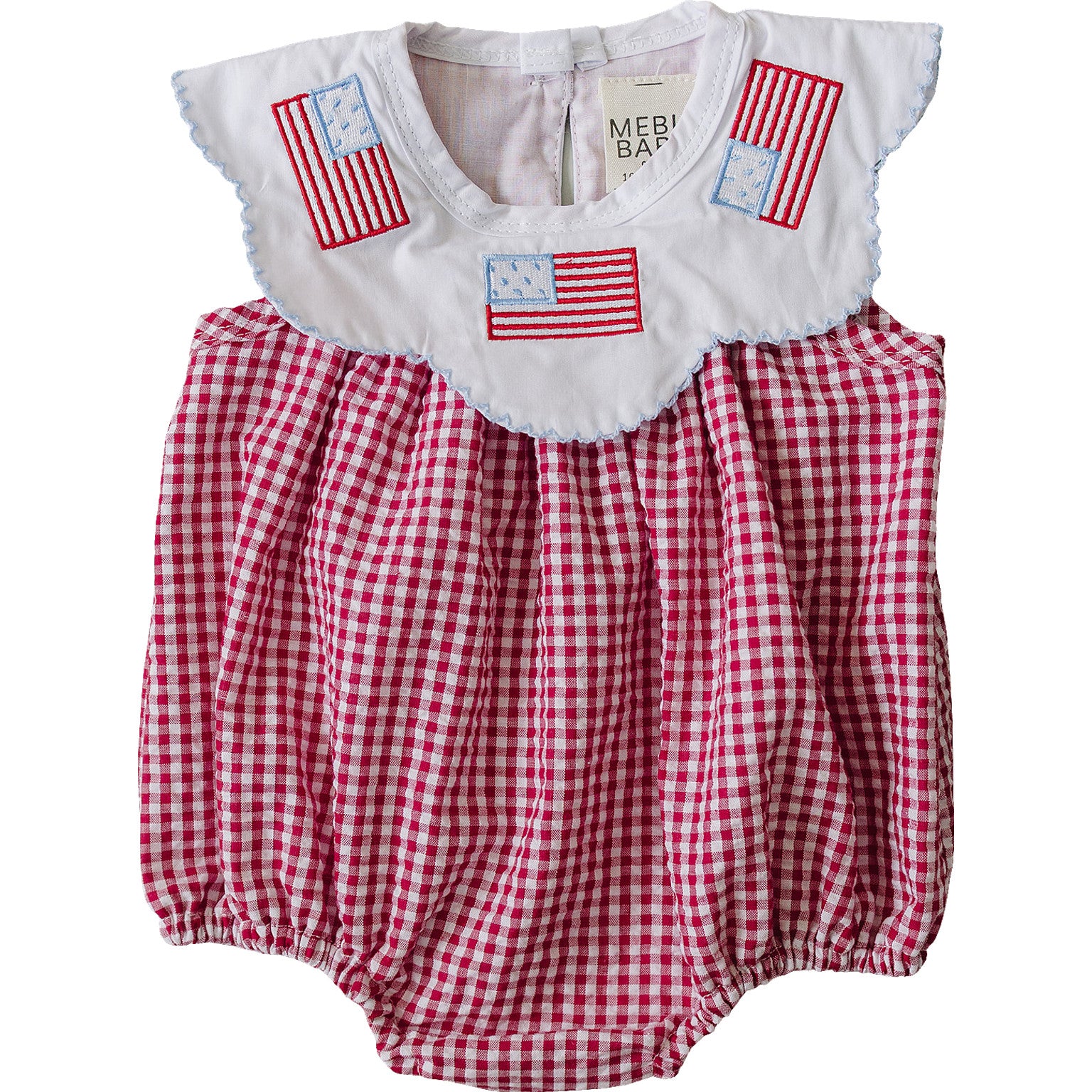 Celebrate in style with this adorable gingham bubble romper, designed for festive fun and all-day comfort. Featuring a classic gingham pattern and sweet embroidered American flags on the smocked collar, this romper is perfect for your baby’s first (or second!) Independence Day!