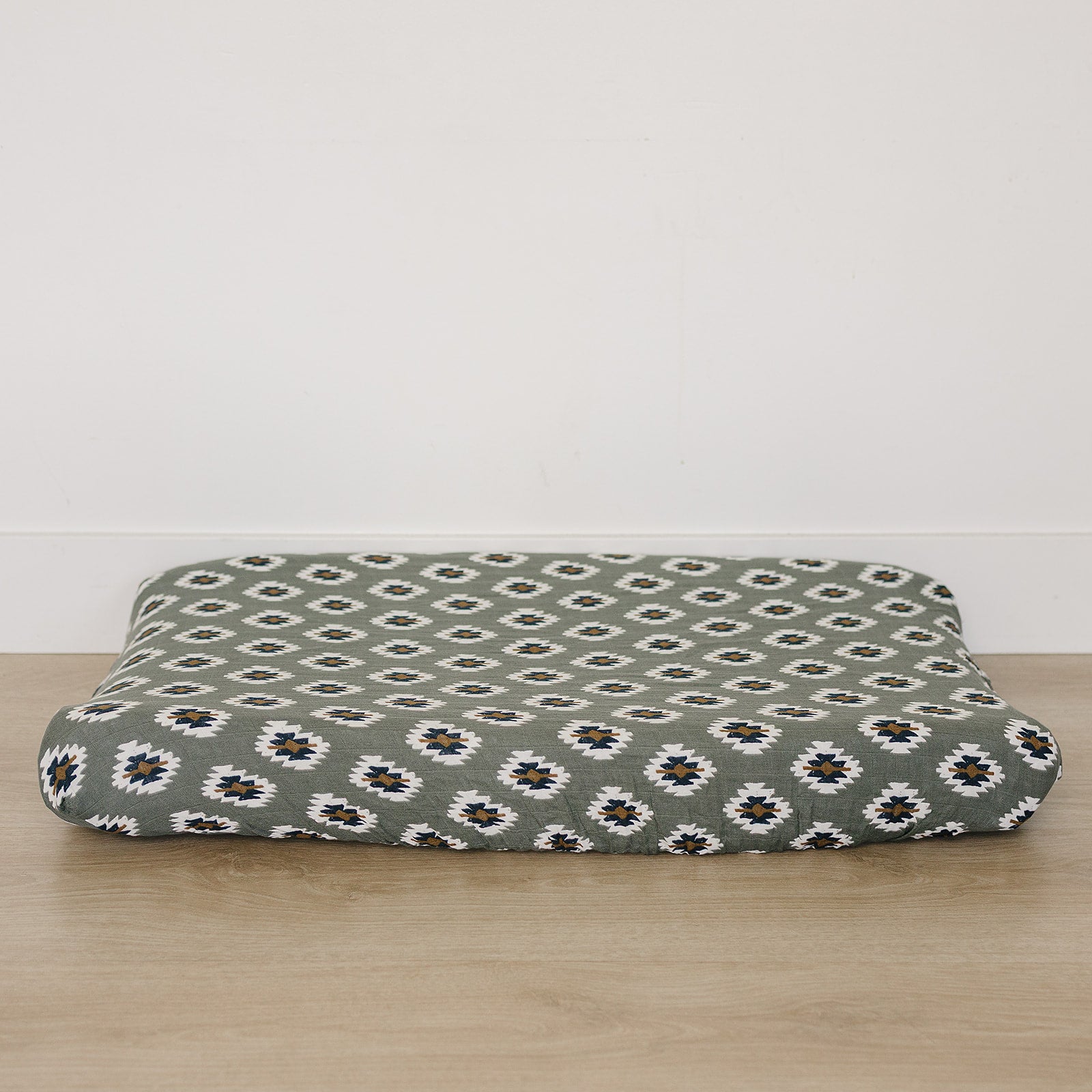 Transform your baby's changing area with the Mebie Baby Green Southwest Muslin Changing Pad Cover. Made from soft and breathable muslin fabric, this cover is gentle on your baby's skin. The fun design adds a touch of modern western style to your nursery decor. The elasticized edges ensure a snug fit on standard changing pads, keeping your little one comfortable during diaper changes. Machine washable for easy care, this changing pad cover is a must-have for any parent looking to combine functionality with fashion.