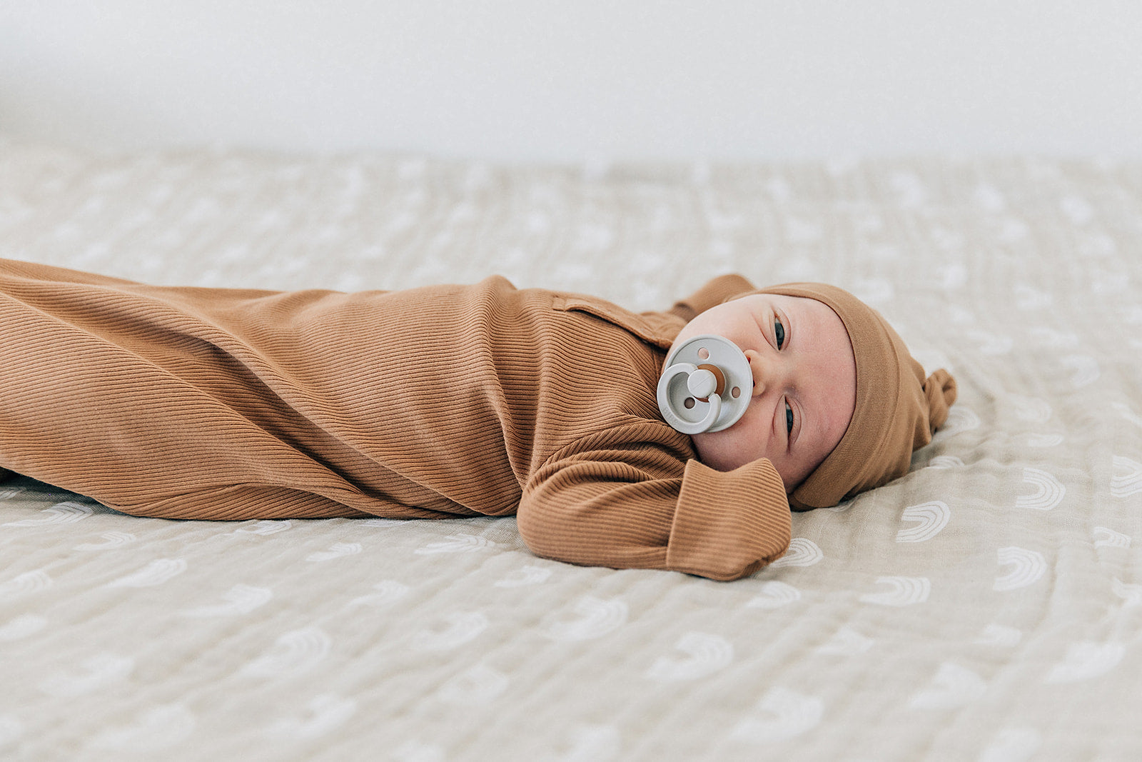 These gowns are size 0-3. The Mebie Baby Organic Knot Gown is a must-have for newborns, offering both comfort and convenience. Crafted from incredibly soft organic cotton, this gown is designed to keep your little one cozy. With a range of gender-neutral designs and colors, it is suitable for any baby. The gown features practical elements such as fold-over hands, two snaps for easy on and off, and shoulder flaps for effortless dressing. The bottom can be conveniently tied and untied in a knot, allowing for quick and hassle-free diaper changes. Simplifying the process of dressing your baby, this gown combines functionality with style, making it an essential addition to your baby's wardrobe.