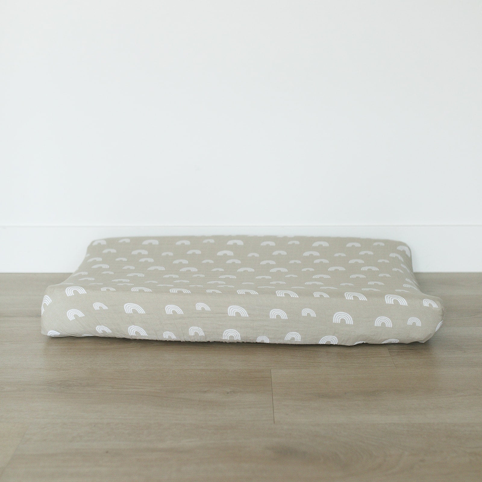 Transform your baby's changing area with the Sand Rainbow Muslin Changing Pad Cover. Crafted from our exclusive designed fabric, this cover is not only soft and breathable but also easy to wash and put on standard changing pads. The soothing sand rainbow color palette adds a touch of elegance to your nursery decor. Ensure your little one's comfort during diaper changes with this stylish and practical accessory.
